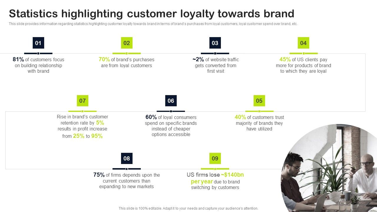 Key Elements Of Strategic Brand Administration Statistics Highlighting Customer Loyalty Towards Brand Topics PDF with all 9 slides: