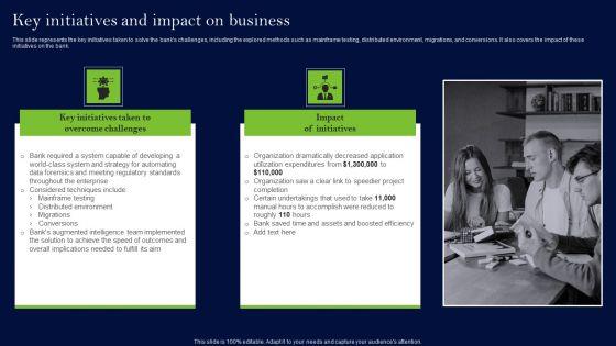 This slide represents the key initiatives taken to solve the banks challenges, including the explored methods such as mainframe testing, distributed environment, migrations, and conversions. It also covers the impact of these initiatives on the bank. Formulating a presentation can take up a lot of effort and time, so the content and message should always be the primary focus. The visuals of the PowerPoint can enhance the presenters message, so our Data Lineage Methods Key Initiatives And Impact On Business Mockup PDF was created to help save time. Instead of worrying about the design, the presenter can concentrate on the message while our designers work on creating the ideal templates for whatever situation is needed. Slidegeeks has experts for everything from amazing designs to valuable content, we have put everything into Data Lineage Methods Key Initiatives And Impact On Business Mockup PDF
