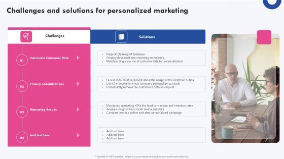 From laying roadmaps to briefing everything in detail, our templates are perfect for you. You can set the stage with your presentation slides. All you have to do is download these easy to edit and customizable templates. Targeted Marketing Campaigns To Improve Buyers Experience Challenges And Solutions For Personalized Inspiration PDF will help you deliver an outstanding performance that everyone would remember and praise you for. Do download this presentation today.
