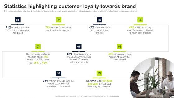 This slide provides information regarding statistics highlighting customer loyalty towards brand in terms of brands purchases from loyal customers, loyal customer spend over brand, etc. Slidegeeks is here to make your presentations a breeze with Key Elements Of Strategic Brand Administration Statistics Highlighting Customer Loyalty Towards Brand Topics PDF With our easy-to-use and customizable templates, you can focus on delivering your ideas rather than worrying about formatting. With a variety of designs to choose from, you are sure to find one that suits your needs. And with animations and unique photos, illustrations, and fonts, you can make your presentation pop. So whether you are giving a sales pitch or presenting to the board, make sure to check out Slidegeeks first