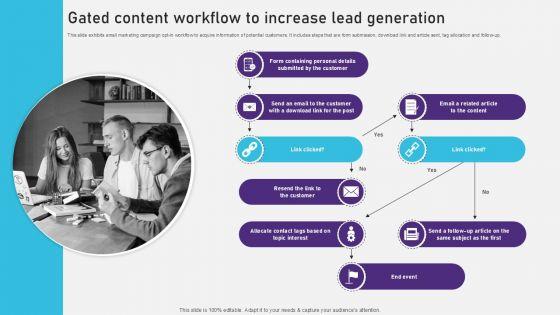 This slide exhibits email marketing campaign opt-in workflow to acquire information of potential customers. It includes steps that are form submission, download link and article sent, tag allocation and follow-up. Do you have to make sure that everyone on your team knows about any specific topic I yes, then you should give Advertising Campaign Optimization Process Gated Content Workflow To Increase Lead Generation Introduction PDF a try. Our experts have put a lot of knowledge and effort into creating this impeccable Advertising Campaign Optimization Process Gated Content Workflow To Increase Lead Generation Introduction PDF. You can use this template for your upcoming presentations, as the slides are perfect to represent even the tiniest detail. You can download these templates from the Slidegeeks website and these are easy to edit. So grab these today.