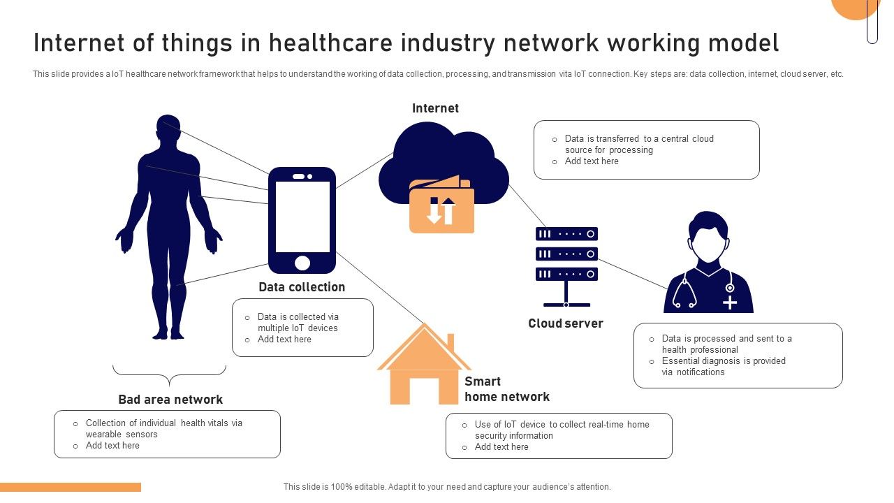 This slide provides a IoT healthcare network framework that helps to understand the working of data collection, processing, and transmission vita IoT connection. Key steps are data collection, internet, cloud server, etc. Presenting Internet Of Things In Healthcare Industry Network Working Model Elements PDF to dispense important information. This template comprises one stages. It also presents valuable insights into the topics including Data Collection, Bad Area Network, Smart Home Network, Cloud Server, Internet. This is a completely customizable PowerPoint theme that can be put to use immediately. So, download it and address the topic impactfully.