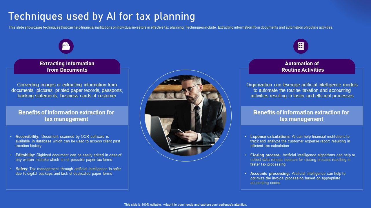 This slide showcases techniques that can help financial institutions or individual investors in effective tax planning. Techniques include Extracting information from documents and automation of routine activities. Are you searching for a Ways Artificial Intelligence Is Transforming Finance Sector Techniques Used By AI For Tax Planning Topics PDF that is uncluttered, straightforward, and original Its easy to edit, and you can change the colors to suit your personal or business branding. For a presentation that expresses how much effort you have put in, this template is ideal. With all of its features, including tables, diagrams, statistics, and lists, its perfect for a business plan presentation. Make your ideas more appealing with these professional slides. Download Ways Artificial Intelligence Is Transforming Finance Sector Techniques Used By AI For Tax Planning Topics PDF from Slidegeeks today.