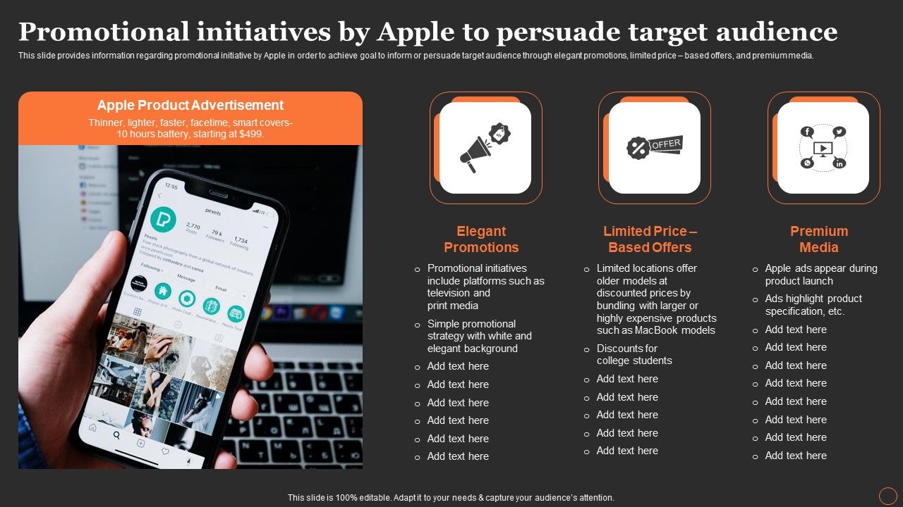 This slide provides information regarding promotional initiative by Apple in order to achieve goal to inform or persuade target audience through elegant promotions, limited price based offers, and premium media. Here you can discover an assortment of the finest PowerPoint and Google Slides templates. With these templates, you can create presentations for a variety of purposes while simultaneously providing your audience with an eye catching visual experience. Download Apples Strategy To Achieve Top Brand Value Position Promotional Initiatives By Apple To Persuade Target Audience Demonstration PDF to deliver an impeccable presentation. These templates will make your job of preparing presentations much quicker, yet still, maintain a high level of quality. Slidegeeks has experienced researchers who prepare these templates and write high quality content for you. Later on, you can personalize the content by editing the Apples Strategy To Achieve Top Brand Value Position Promotional Initiatives By Apple To Persuade Target Audience Demonstration PDF.