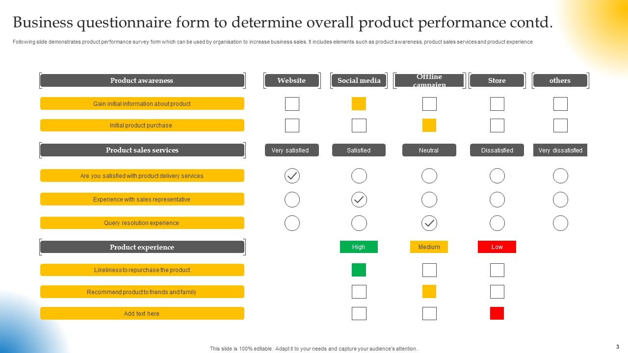 Improve your presentation delivery using this Business Questionnaire Ppt PowerPoint Presentation Complete Deck With Slides Survey. Support your business vision and objectives using this well-structured PPT deck. This template offers a great starting point for delivering beautifully designed presentations on the topic of your choice. Comprising six this professionally designed template is all you need to host discussion and meetings with collaborators. Each slide is self-explanatory and equipped with high-quality graphics that can be adjusted to your needs. Therefore, you will face no difficulty in portraying your desired content using this PPT slideshow. This PowerPoint slideshow contains every important element that you need for a great pitch. It is not only editable but also available for immediate download and utilization. The color, font size, background, shapes everything can be modified to create your unique presentation layout. Therefore, download it now.