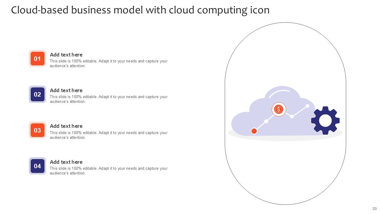 Boost your confidence and team morale with this well-structured Cloud Based Business Model Ppt PowerPoint Presentation Complete Deck With Slides. This prefabricated set gives a voice to your presentation because of its well-researched content and graphics. Our experts have added all the components very carefully, thus helping you deliver great presentations with a single click. Not only that, it contains a set of twenty four slides that are designed using the right visuals, graphics, etc. Various topics can be discussed, and effective brainstorming sessions can be conducted using the wide variety of slides added in this complete deck. Apart from this, our PPT design contains clear instructions to help you restructure your presentations and create multiple variations. The color, format, design anything can be modified as deemed fit by the user. Not only this, it is available for immediate download. So, grab it now.