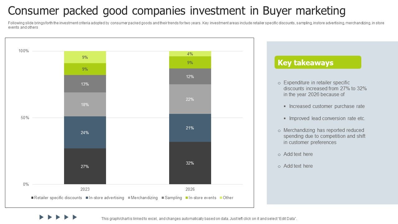 Following slide brings forth the investment criteria adopted by consumer packed goods and their trends for two years. Key investment areas include retailer specific discounts, sampling, instore advertising, merchandizing, in store events and others Showcasing this set of slides titled Consumer Packed Good Companies Investment In Buyer Marketing Infographics PDF. The topics addressed in these templates are Key Takeaways, Buyer Marketing, Purchase Rate. All the content presented in this PPT design is completely editable. Download it and make adjustments in color, background, font etc. as per your unique business setting.