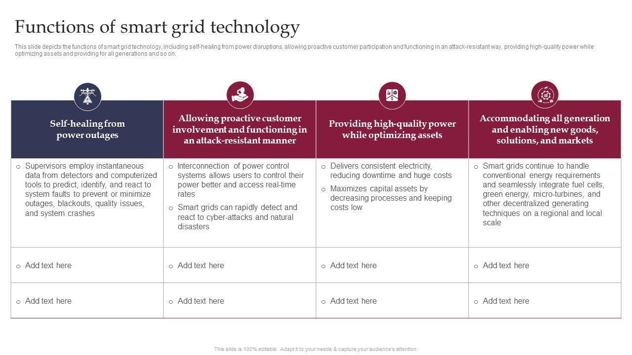 This slide depicts the functions of smart grid technology, including self-healing from power disruptions, allowing proactive customer participation and functioning in an attack-resistant way, providing high-quality power while optimizing assets and providing for all generations and so on. Create an editable Smart Grid Technology Functions Of Smart Grid Technology Guidelines PDF that communicates your idea and engages your audience. Whether youre presenting a business or an educational presentation, pre designed presentation templates help save time. Smart Grid Technology Functions Of Smart Grid Technology Guidelines PDF is highly customizable and very easy to edit, covering many different styles from creative to business presentations. Slidegeeks has creative team members who have crafted amazing templates. So, go and get them without any delay.