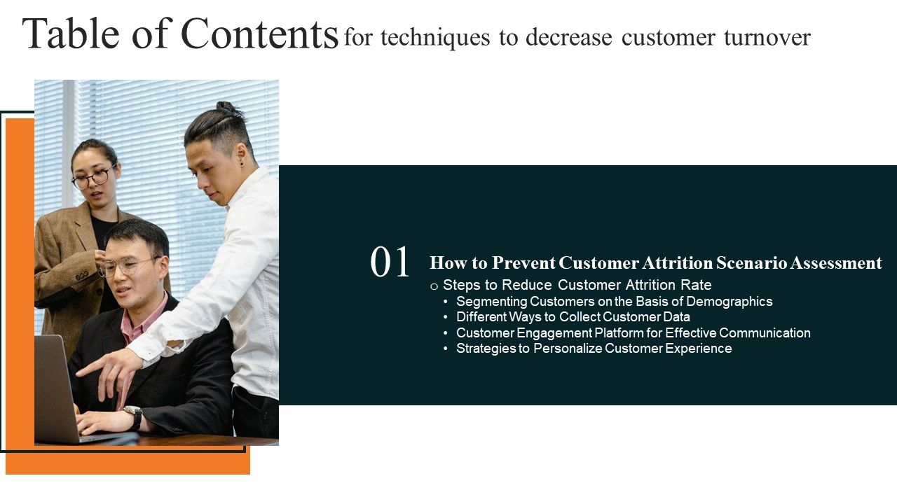 Create an editable Table Of Contents For Techniques To Decrease Customer Turnover Inspiration PDF that communicates your idea and engages your audience. Whether youre presenting a business or an educational presentation, pre-designed presentation templates help save time. Table Of Contents For Techniques To Decrease Customer Turnover Inspiration PDF is highly customizable and very easy to edit, covering many different styles from creative to business presentations. Slidegeeks has creative team members who have crafted amazing templates. So, go and get them without any delay.