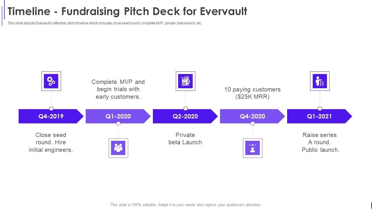This slide depicts Evervaults effective pitch timeline which includes close seed round, complete MVP, private beta launch, etc. Presenting Timeline Fundraising Pitch Deck For Evervault Ppt Pictures Rules PDF to provide visual cues and insights. Share and navigate important information on five stages that need your due attention. This template can be used to pitch topics like Close Seed Round, Hire Initial Engineers, Private Beta Launch. In addtion, this PPT design contains high resolution images, graphics, etc, that are easily editable and available for immediate download.