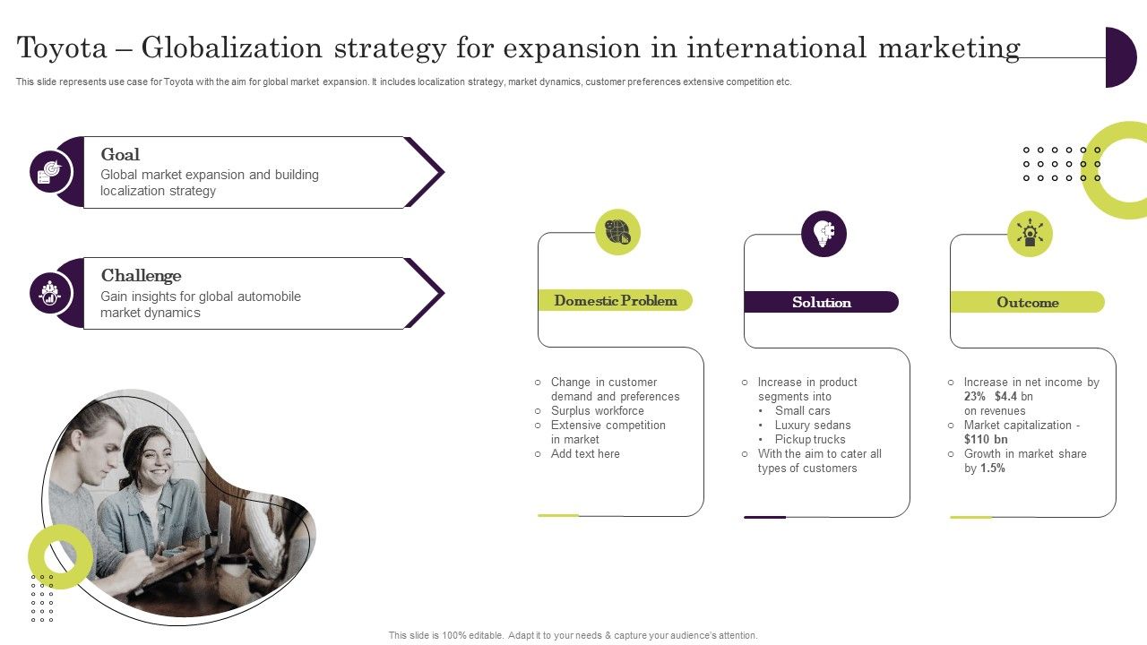This slide represents use case for Toyota with the aim for global market expansion. It includes localization strategy, market dynamics, customer preferences extensive competition etc. Slidegeeks has constructed Toyota Globalization Strategy For Expansion In International Marketing Demonstration PDF after conducting extensive research and examination. These presentation templates are constantly being generated and modified based on user preferences and critiques from editors. Here, you will find the most attractive templates for a range of purposes while taking into account ratings and remarks from users regarding the content. This is an excellent jumping off point to explore our content and will give new users an insight into our top notch PowerPoint Templates.
