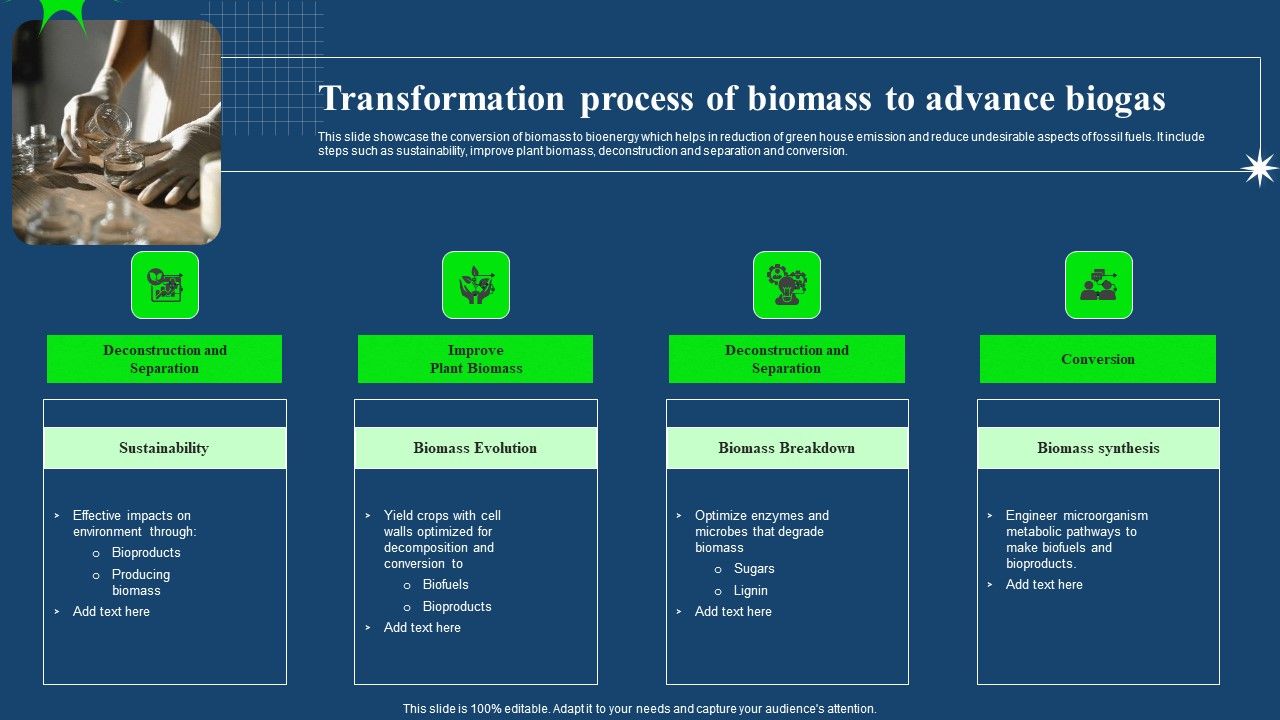 This slide showcase the conversion of biomass to bioenergy which helps in reduction of green house emission and reduce undesirable aspects of fossil fuels. It include steps such as sustainability, improve plant biomass, deconstruction and separation and conversion. Showcasing this set of slides titled Transformation Process Of Biomass To Advance Biogas Summary PDF. The topics addressed in these templates are Sustainability, Biomass Evolution, Biomass Breakdown. All the content presented in this PPT design is completely editable. Download it and make adjustments in color, background, font etc. as per your unique business setting.