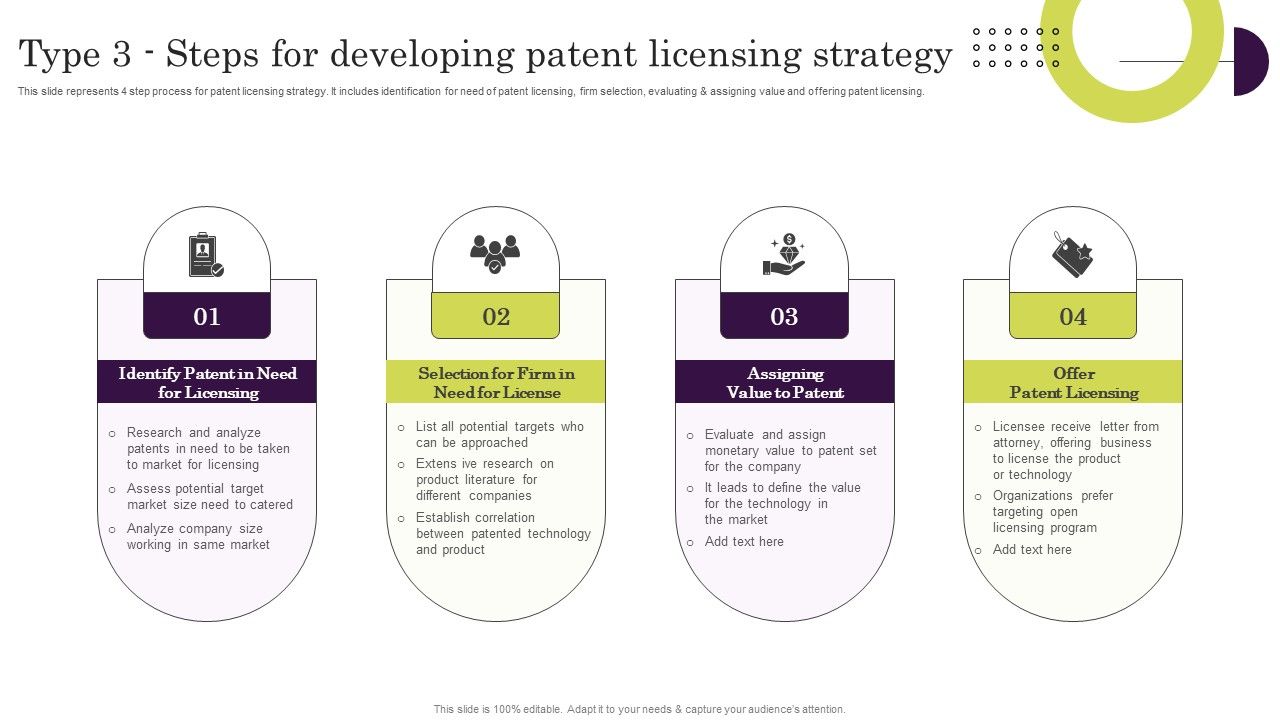 This slide represents 4 step process for patent licensing strategy. It includes identification for need of patent licensing, firm selection, evaluating and assigning value and offering patent licensing. If your project calls for a presentation, then Slidegeeks is your go to partner because we have professionally designed, easy to edit templates that are perfect for any presentation. After downloading, you can easily edit Type 3 Steps For Developing Patent Licensing Strategy Ppt Portfolio Slide Download PDF and make the changes accordingly. You can rearrange slides or fill them with different images. Check out all the handy templates.