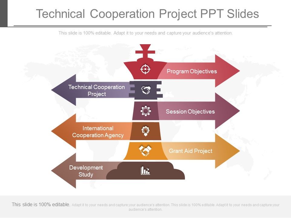 This is a technical cooperation project ppt slides. This is a six stage process. The stages in this process are program objectives, technical cooperation project, session objectives, international cooperation agency, grant aid project, development study.