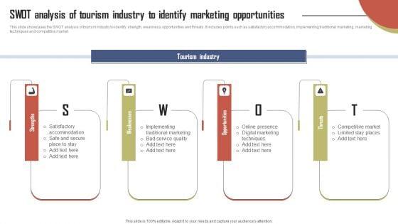 This slide showcases the SWOT analysis of tourism industry to identify strength, weakness, opportunities and threats. It includes points such as satisfactory accommodation, implementing traditional marketing, marketing techniques and competitive market. Slidegeeks is here to make your presentations a breeze with SWOT Analysis Of Tourism Industry Identify Marketing Effective Travel Marketing Guide For Improving Slides PDF With our easy-to-use and customizable templates, you can focus on delivering your ideas rather than worrying about formatting. With a variety of designs to choose from, you are sure to find one that suits your needs. And with animations and unique photos, illustrations, and fonts, you can make your presentation pop. So whether you are giving a sales pitch or presenting to the board, make sure to check out Slidegeeks first